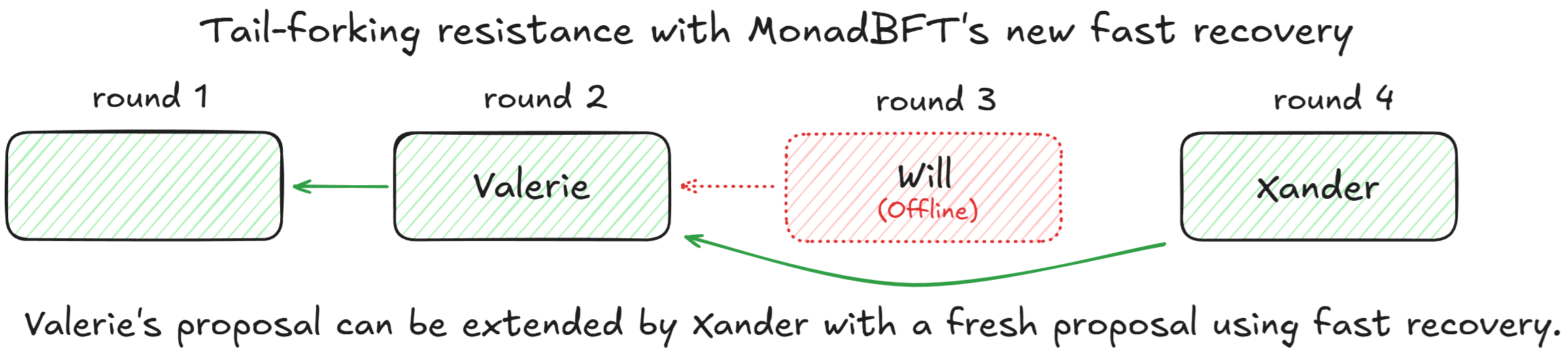 This ensured that honest validators' blocks would eventually be included. However, it came with a cost. The reproposal itself consumes an entire round, and during that round, no new block can be proposed. If a user submitted a transaction during Will’s round, they would have to wait two additional rounds before any possibility of their transaction being proposed. The new MonadBFT paper shows we can maintain tail-forking resistance and avoid a round dedicated to reproposal in most cases. If the next leader (Xander) has a QC for Valerie’s block and can provide evidence that Will did not make a valid proposal with sufficient support, then Xander can make a fresh block proposal that directly extends Valerie’s block. How is that achieved? Via fast recovery.