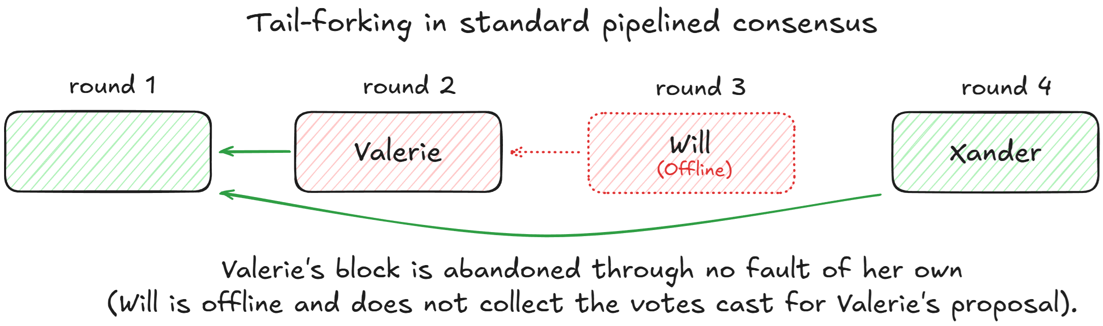 In our previous blog post, we demonstrated how pipelined BFT protocols are vulnerable to tail-forking. Consider an example where Valerie, Will, and Xander lead three consecutive rounds. In standard pipelined consensus, Valerie's block cannot be finalized if Will (the subsequent leader) goes offline—this is because pipelined protocols rely on the next leader to collect votes for the previous leader's proposal. With Will offline and the votes lost, Xander ends up abandoning Valerie's block. The situation is even worse if Will is malicious rather than offline: he can intentionally abandon Valerie's block to steal her transactions and extract MEV for himself. That’s why pipelined consensus protocols should be tail-forking resistant: once a QC for a block is formed, it should not be abandoned (except in the rare case of leader equivocation).