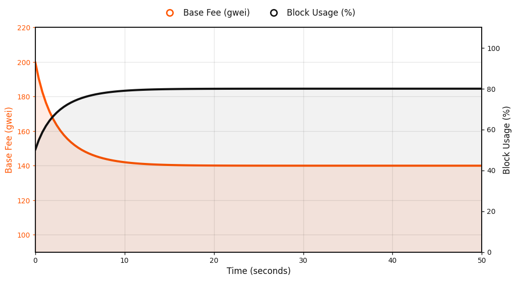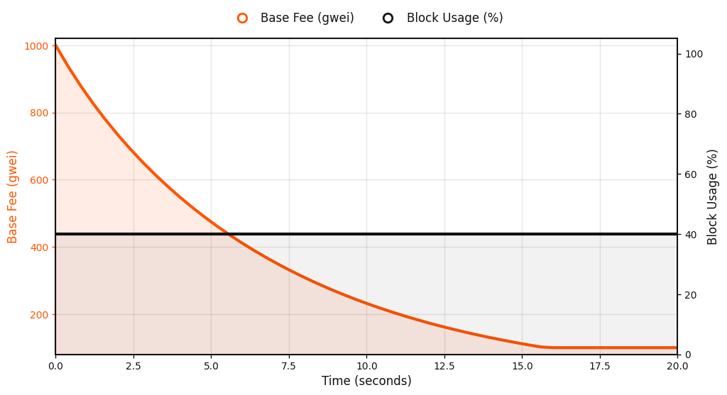 This exponential form ensures smooth, continuous changes in the base fee. When demand is persistently high or low, the base fee ramps decisively upward or downward until equilibrium is restored. Short-lived demand fluctuations are largely ignored.