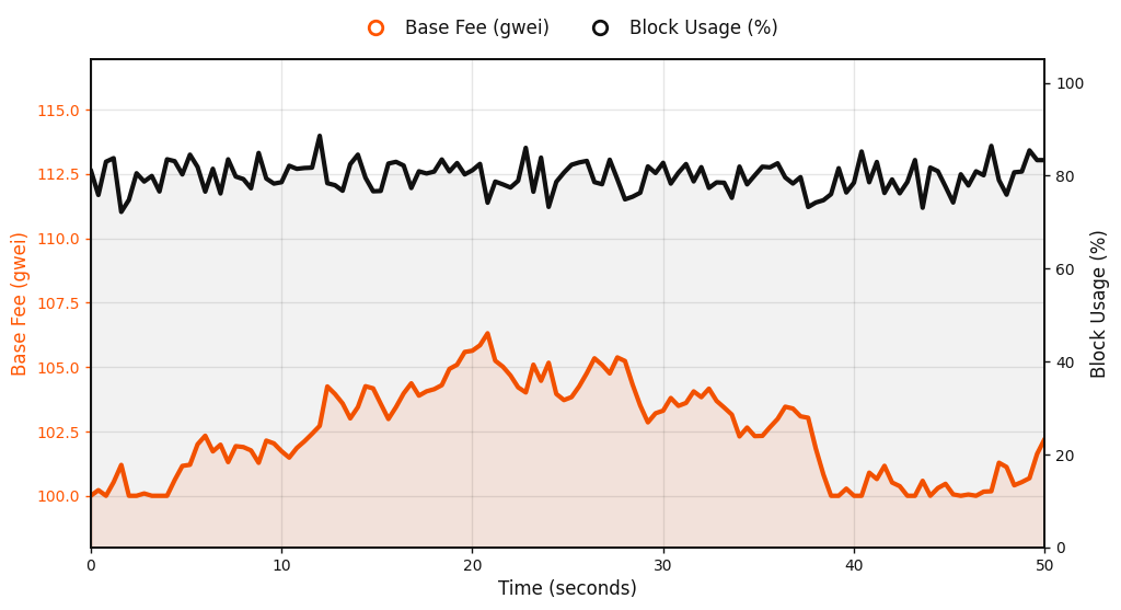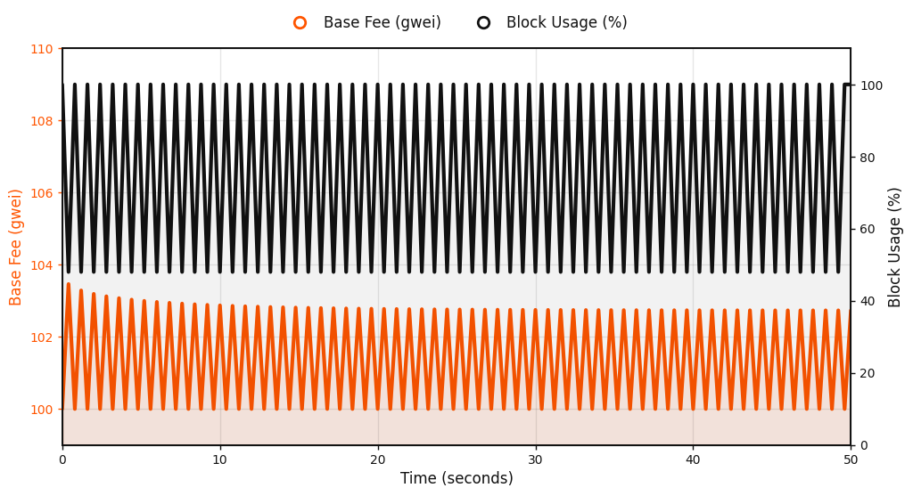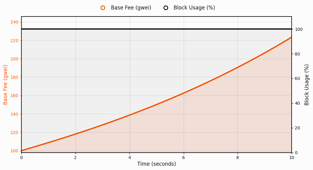 Sustained demand drives the fee. If blocks stay full for many seconds in a row, the base fee reacts quickly, rising until demand no longer exceeds the target. In the extreme, it can reach about 1.4× over 4 seconds. The same responsiveness applies even more quickly in reverse, with the fee declining rapidly when blocks are persistently empty. This asymmetry in responsiveness biases base fees lower, making transactions cheap to include for users.