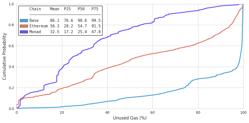 The figure below shows the gas-weighted cumulative distribution of unused gas across Ethereum, Base, and Monad. For each transaction, unused gas is defined as: