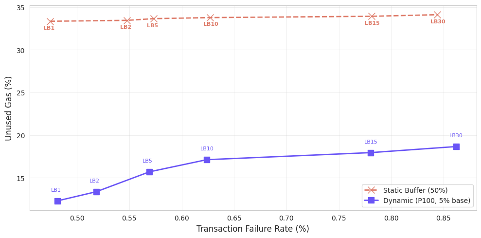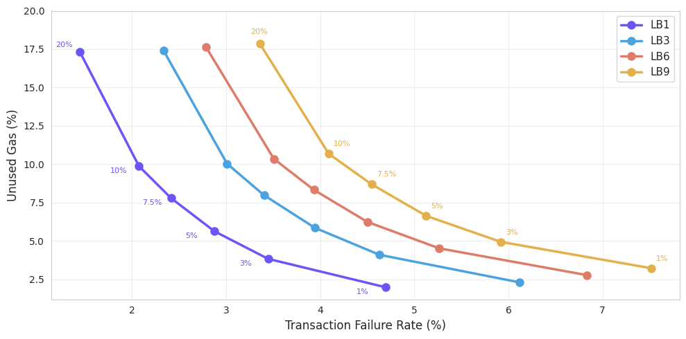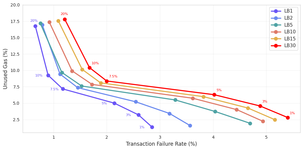 As expected, smaller buffers (bottom-right of the chart) lead to very low unused gas but also higher failure rates. Failure rates rise steadily as the lookback increases, reflecting growing estimation error when using stale state. For example, with a 1% buffer, unused gas remains very low at around 1–3%, but failure rates increase from roughly 2.9% at LB1 to about 5.4% at LB30.