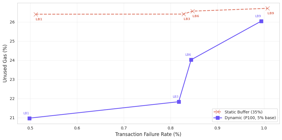 On both Monad and Base, dynamic buffering achieves lower unused gas at comparable failure rates by allocating headroom selectively. Beyond motivating a general-purpose strategy, the dynamic buffering results indicate that application developers with transaction-specific context can encode tighter gas limits directly to further increase utilization rates.